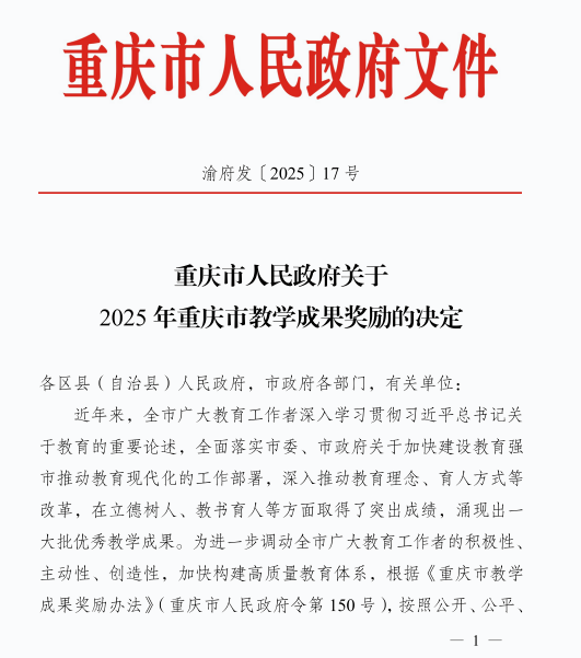 近日,重慶市人民政府印發(fā)《關(guān)于2025年重慶市教學成果獎勵的決定》(渝府發(fā)【2025】7號),我校榮獲2025年職業(yè)教育重慶市教學成果獎特等獎1項、二等獎1項。